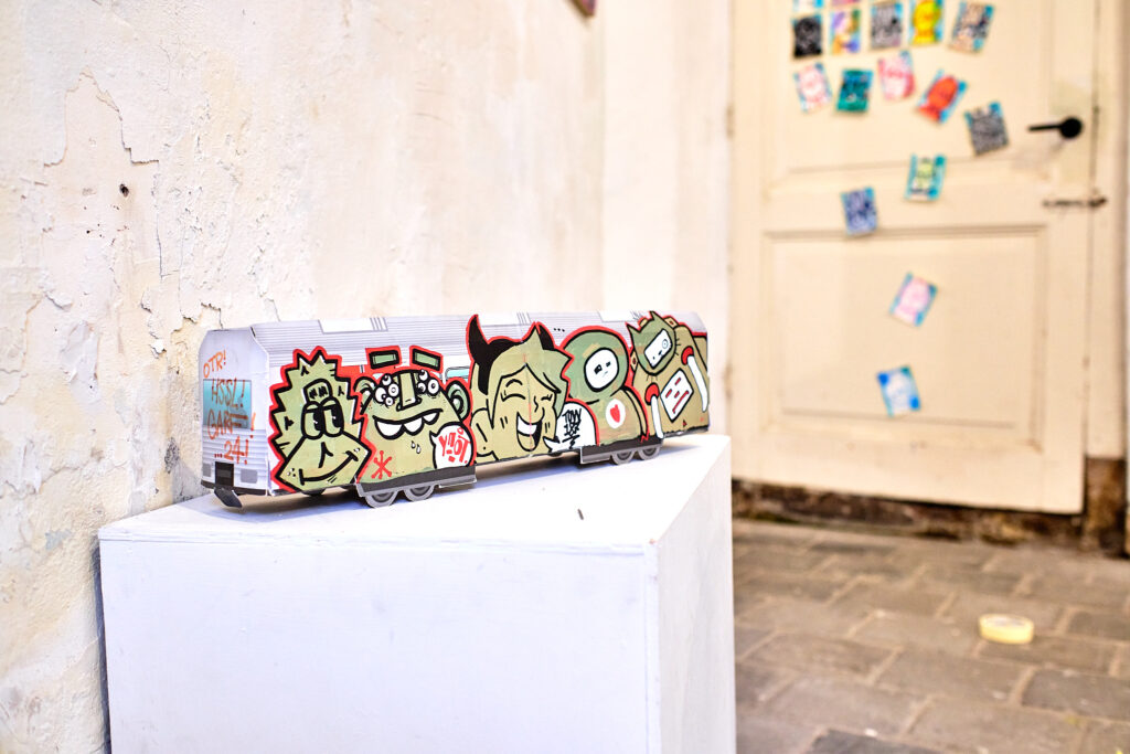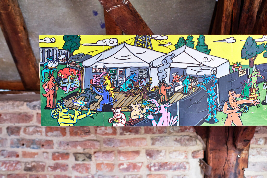 Naast al deze anonieme straatkunstenaars is ook het werk van Jesse Averdijk te zien. Speciaal voor deze expositie heeft hij zijn 26 luik meegenomen naar het Langhuis. Ja, je leest het goed: 26! Een gigantische 3 luik. Zijn kunst is bedoeld om een gevoel van plezier en ontdekking op te roepen bij de kijker door middel van kleurrijke en absurde scenes. ‘Het gebruik van dieren kan worden uitgelegd door hun intrinsieke neiging om geen schaamte te voelen, net als de mogelijkheid voor een grote diversiteit in vorm en formaat. In plaats van het proberen te spiegelen of bekritiseren van verschillende maatschappelijke thema’s probeert deze kunst de gemoedstoestand van de kijker te verbeteren.’